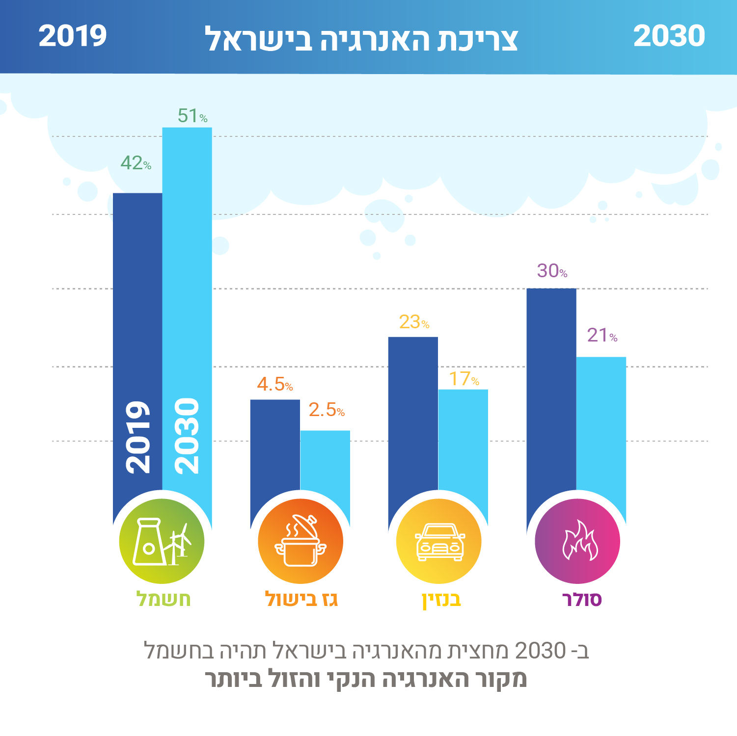כך לדוגמא, אם עד היום כ-0.5% בלבד מכלי הרכב בישראל מונעים בחשמל, בשנת 2030 מספר כלי הרכב החשמליים יעמוד על כ-1.3 מיליון ויהווה קרוב ל-30% ממצבת הרכבים. לפחות 50% מהאוטובוסים העירוניים החדשים הינם חשמליים, במקביל לחישמול רכבת ישראל וכניסת קווי המטרו סך צריכת החשמל של סקטור התחבורה תגיע ל-6.5 מיליארד קוט"ש עד סוף העשור.