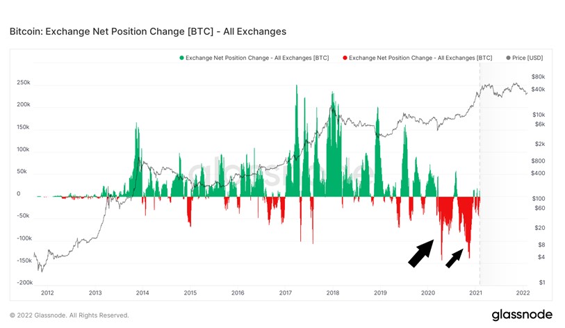 זרימת המטבעות החוצה מהבורסות מהווה סימן חיובי, שכן ככל שיש זרימה פנימה אל הבורסות זה מעיד על כוונתם של המשקיעים לבצע פעולות מסחר ובכלל זה למכור את המטבעות או להמירם למטבעות שונים. אך כאשר מדובר על זרימה החוצה מהבורסות, המשקיעים מאותתים כי אינם מתכוונים לבצע פעולות במטבעות ולעת עתה מעדיפים לקנות ולהחזיק לטווח הארוך.