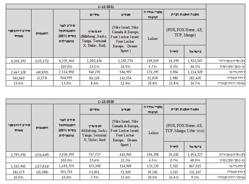 נתוני מכירות חנויות זהות (בתקופות בהן החנויות היו פתוחות באופן מלא) בנטרול תקופות הסגר עלו ברבעון הרביעי לשנת 2021 בהשוואה לאותה התקופה בשנת 2019 במגזר אופנה ואופנת הבית בכ-12.5%, מגזר האווירה והטיפוח בכ-17.3% ובמגזר הספורט בכ-23.1%.