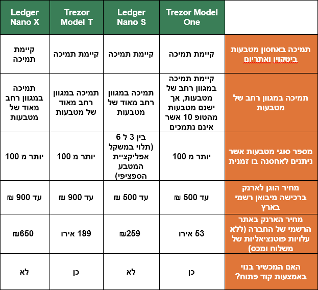 טבלת השוואה בין ארבעת המודלים המובילים של הארנקים הקרים:
