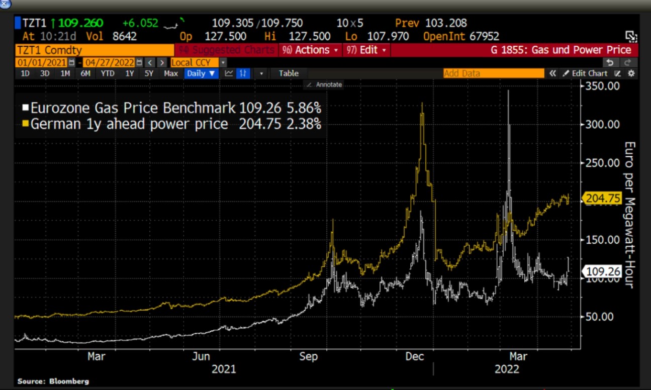 מחיר הגז הטבעי באירופה (TTF) ירד מראשית אפריל, על רקע ההבנות בין רוסיה וגרמניה בנוגע לאופן התשלום בגין הגז הטבעי המיובא מרוסיה ולצד אספקה של גז טבעי מונזל מארה"ב, מה שהפחית את חששות המשקיעים להחרפת משבר האנרגיה באירופה.