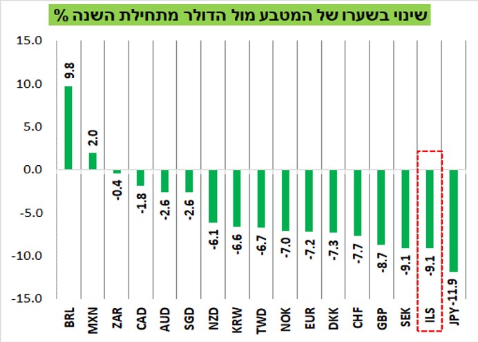 היחלשות השקל התגברה על רקע הירידות בשוק המניות ועליית התשואות בארה"ב. השקל היה בין המטבעות החלשים ביותר מתחילת השנה מול הדולר לעומת השנים הקודמות בהם בלט השקל בהתחזקותו למרות התחזקות הדולר בעולם.
