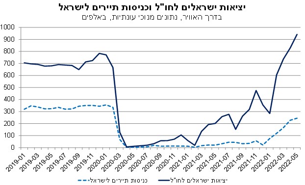 הגידול החד והמשמעותי ביציאות של ישראליים לחו"ל, נרשם לאחר דעיכתו של גל ה"אומיקרון" בישראל ובעולם, החל מחודש פברואר השנה, שאפשרה את ההסרה של הגבלות הקורונה על טיסות לחו"ל, ואת חזרתו של ענף התיירות לפעילות. מאז ועד חודש מאי גדל היקף היציאות לחו"ל בכ-657 אלף (פי 2.3 לעומת הרמה של ינואר).