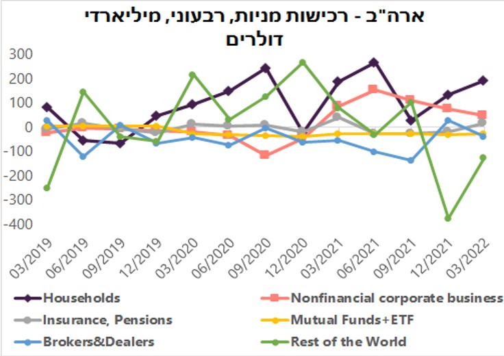 הרוכשים הגדולים של המניות האמריקאיות ברבעון הראשון היו משקי הבית (Households) שקנו מניות בסך של כ-200 מיליארד דולר נטו . בקטגוריה זו יכולים להיכנס קרנות הגידור, מנהלי תיקים וסוגי משקיעים אחרים שאינם מתאימים להגדרות אחרות. גם המגזר העסקי והמוסדיים (פנסיה וביטוח) רכשו מניות, אך בכמויות קטנות הרבה יותר ממשקי הבית.