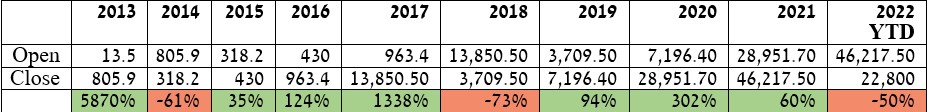 הביטקוין ירד "רק" 50% מתחילת שנה, עדיין לא קרוב לרמות אליהם הגיע ב 2018 73%- או ב- 2014 61%- יתרה מכך, ב 2014 בשיא הירידה ההפסד היה צורם הרבה יותר – 89% ירידה.