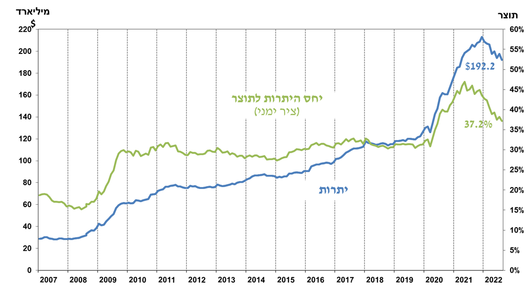 רמת יתרות מטבע החוץ ויחס היתרות לתוצר המקומי הגולמי, 2007 עד 2022