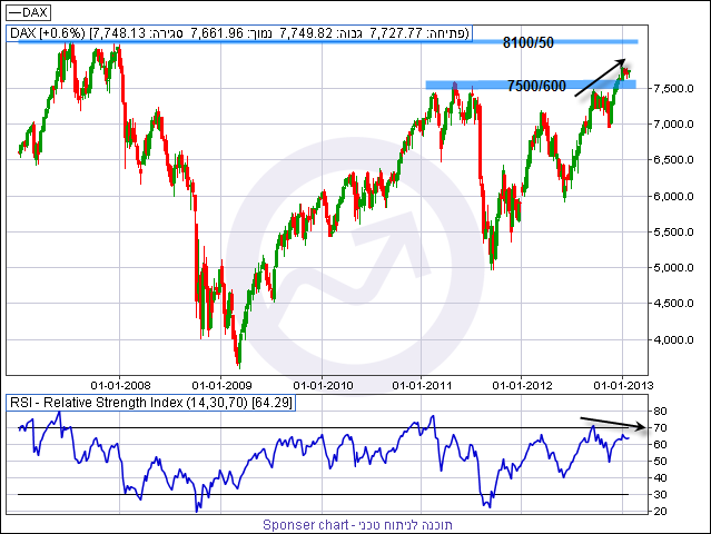כל עוד המדד נסחר מעל רצועת המחירים של 7500/7600 נקודות פניו של המדד יהיה למעלה אל עבר רמות השיא של שנת 2007 סביב 8100 נקודות. יחד עם זאת חשוב לציין שלא מעט אינדיקטורים טכניים נמצאים ברמות גבוהות מאוד בגרף השבועי ואף ניתן לראות סטייה דובית קלה שטרם יצאה למימוש. למחזיקים בפוזיציית לונג אין סיבה לדאגה בשלב זה אולם הם צריכים להיות ערניים יותר על אחת כמה וכמה ששנת בחירות לפנינו בגרמניה ועל אחת כמה וכמה שנוכח כל האתגרים הקיימים אנו מתקרבים לרמות שיא רב שנתיות.