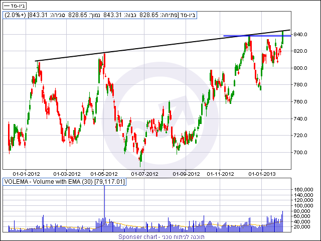 כעת, המדד הגיע לנקודת מבחן באזור 850 נקודות ובמידה ויפרוץ את ההתנגדות הכפולה, המורכבת מהתנגדות אופקית ומקו המגמה העולה (ראה גרף) יתקבל איתות קניה עם יעד עליות של כ- 20%.