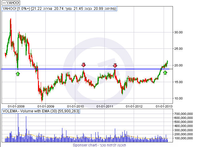 כפי שניתן לראות בגרף השבועי המצורף, מניית יאהו נמצאת בשיא של 4 שנים מאז מחירי השפל אליה הגיעה בסוף שנת 2008 (לאחר ניסיון ההשתלטות העוין של חברת מייקרוסופט שנכשל) המניה פרצה ואף נתמכה לאחרונה מעל רמה של 19$ ובכך התקבל איתות קניה טכני ברור עם יעד גבוה במיוחד של 30$ (אפסייד של כ- 40%).