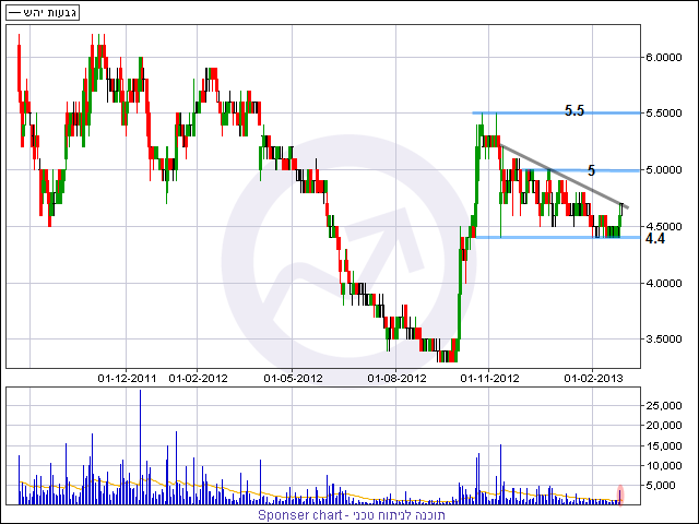 לאחר העליות החדות במניה בחודש אוקטובר האחרון המניה עושה תיקון ע"י תנועה אופקית בת ארבעה חודשים בקירוב. אזור של 4.4 הינו אזור תמיכה חשוב מאוד, והוא מהווה גם אזור תמיכה אופקי וגם תיקון 50% לגל העליות שצוין לעיל.