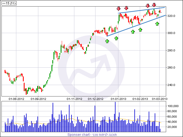 בחודשים האחרונים המדד אינו מצליח להתקדם צעד נוסף ברצף העליות והתבנית שקיימת על הגרף מזמינה היפוך מגמה לטווח הקצר. שבירה של קו התמיכה של היתד באזור של 318-9 נקודות תוציא את התבנית אל הפועל עם יעד לאזור 298-300 נקודות.