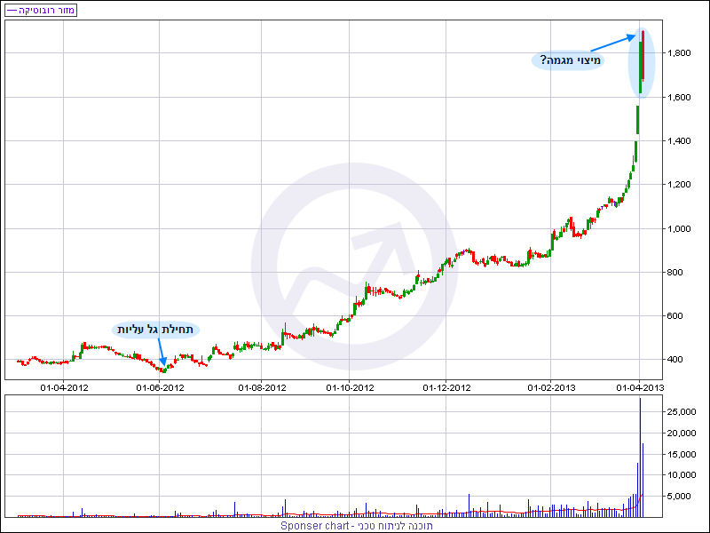 מניית מזור נסחרת במגמה עולה החל מחודש יוני 2012 והניבה עד כה תשואה חיובית פנומנאלית של 336%. לקראת סוף חודש מרץ מגמת העליות התחדדה עד כדי כך שגרף המחיר מציג עליה בזווית של 90 מעלות! משמע יש פעילות של מכונות וסוחרי יום אשר מחפשים תנודות ונזילות מרבית כספקולציה ותו לא. פעילות זו לרוב מביאה גם לסיומה של המגמה שכן המשקיעים לטווח ארוך לא יסגרו פוזיציית לונג בעוד שסוחרי היום יזרקו סחורה כדי לא "לכבות את האור".