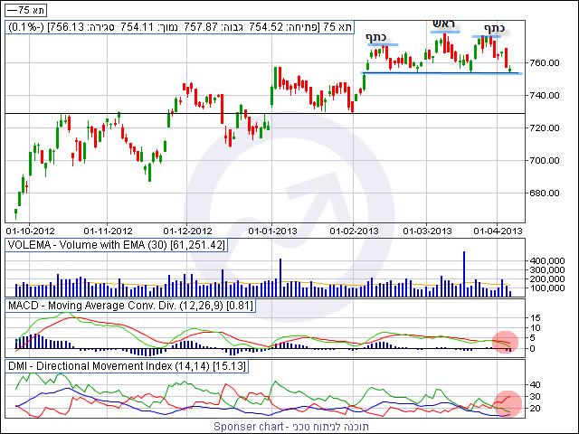 חשוב להדגיש ולציין שיציאה לפועל של התבנית תתרחש בשבירה ברורה של קו הצוואר שהוא קו התמיכה האופקי המסומן על הגרף המצורף ברמה של 753 נקודות והיעד הנגזר של התבנית הינו לאזור של 727/8 נקודות שם גם נמצאת תמיכה אופקית חזקה.