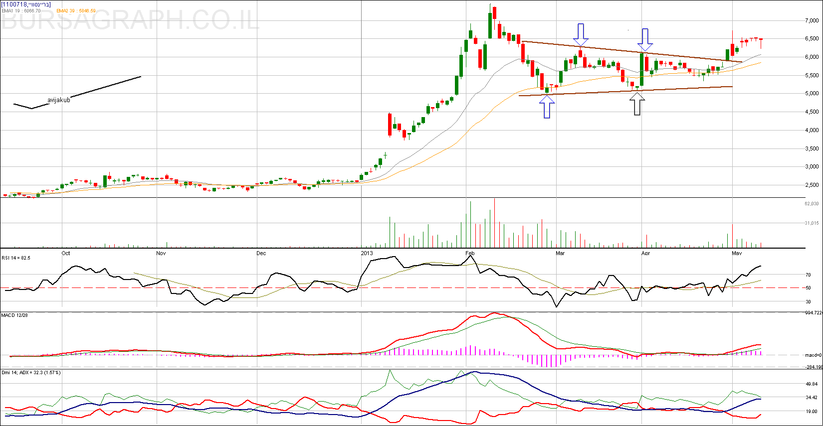 ניתוח טכני - ניתן לראות, כי לאחרונה, לאחר מימוש דיי חריף מרמת השיא השנתי, נכנסה המניה לתחום ברור של התכנסות מחירים ברורה, כאשר איתות על מהלך חד נוסף יתקבל ביציאה מתחום התכנסות המחירים הנוכחית. נכון להיום, פריצה תיחשב, נעילה מעל רמת 5950, בעוד ששבירת ההתכנסות, תאשר נעילה מתחת לרמת אזור 5200. נציין כי יציאה ברורה מתחום ההתכנסות יאותת על תנועה בת כ-20 אחוז, לכיוון הרלוונטי של האיתות. שווה מעקב, כי האיתות כנראה, בהחלט קרוב.