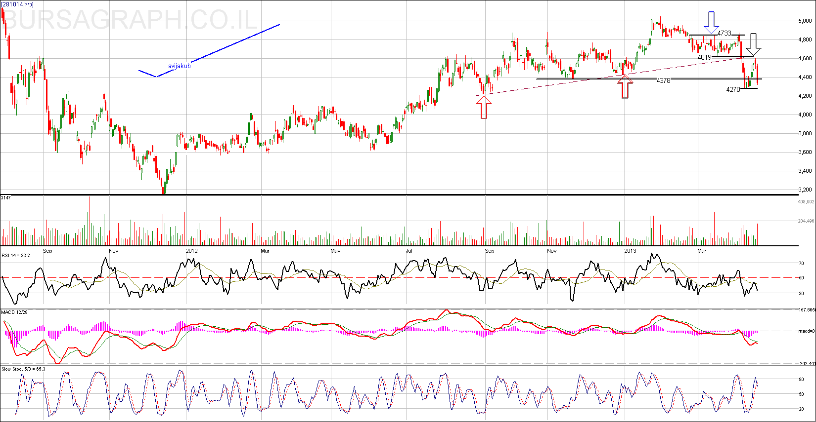 ניתוח טכני - ניתן לראות כי המניה, שברה לאחרונה תמיכה עולה ראשית , וכמו כן את רמת התמיכה האופקית ברמת 4378. לכן המניה כעת תחת איתות שלילי, השבוע התבצע תיקון עולה ,אולם בסיום השבוע שבה המניה אל אזור התמיכה של השפל שנוצר לאחרונה באזור 4270. סביר כי רמה זו תיבדק ביום המסחר הבא, והאיתות הבא יתקבל ביכולת המניה להתמודד עם תמיכה זו. איתות חיובי לתיקון עולה נוסף, יתקבל רק ביכולת נעילה מעל רמת ההתנגדות הקרובה על 4378.