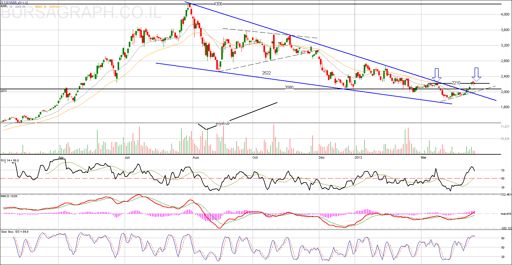 ניתוח טכני - המניה שנסחרת במדד ת"א 100, שנמצאת לאחרונה לאחר מימוש עמוק, וירידה דרסטית, ולאחרונה ניתן לראות כי תבנית התכנסות מחירים, דמוי יתד שוורית, נפרצה השבוע. בשלב זה המניה הגיעה עד ליעד התיקון העולה הראשון על רמת אזור 2210 , בינתיים נבלמה סביב אזור זה. אין להמעיט ,כעת בפריצת התבנית היורדת ארוכת הטווח, אולם שילוב של תמונה טכנית מעט גבוהה בייחוד באינדיקטורים הקצרים יכול להוציא דשדוש עם תמיכה על 2080. בכל מקרה נעילה מעל 2280 עתידי, יאשר איתות נוסף להמשך התיקון העולה. נציין כי בגרפים ארוכי הטווח, ניכרים איתותים חיובים בחלק לא מבוטל מהאינדיקטורים.