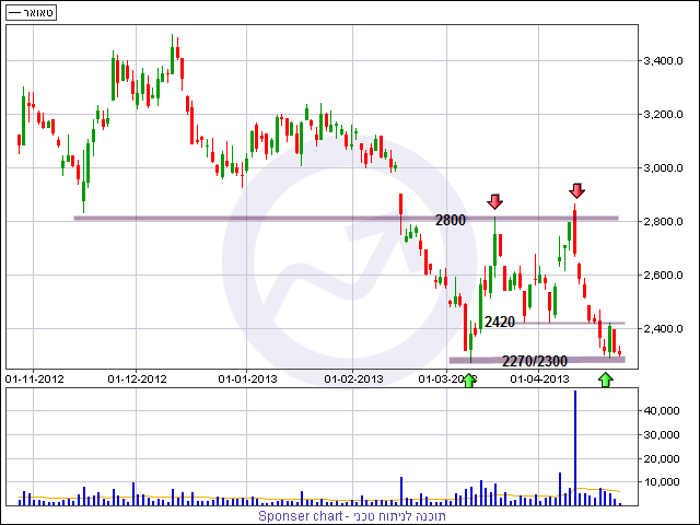 אם נתעלם לרגע מאחזקות הבנקים והמרת שטרי ההון שידועים כבר לכולם אזי נראה שמניות החברה נסחרות סמוך מאוד לשפלים האחרונים סביב רמה של 2270-2300 נקודות. היפוך מעל רמה זו התבצע כבר ביום שלישי בשבוע שעבר אולם ניתוח גלובס שהוזכר מעלה החזיר את המוכרים ואת המניה לרמות השפל שצוינו מעלה. אזור 2420 מהווה התנגדות בטווח הקצר ויציאה מעליו יכולה להוציא תיקון עולה עם יעד מהיר ל 2600 נקודות. מנגד שבירת התמיכה יכולה להכניס עוד מוכרים למניה ולקחת אותה לרמות נמוכות עוד יותר שנראו לאחרונה רק בשנת 2009.