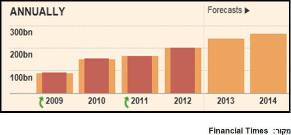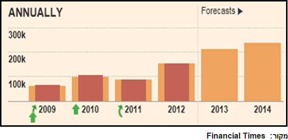 מכירות החברה (במונחי וון קוריאני) בשנים 2009-2012, ותחזיות ל-2013-2014.