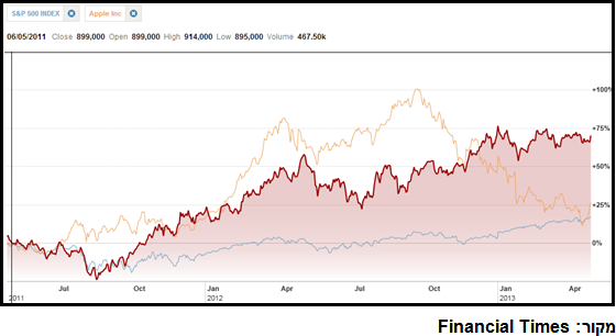 סמסונג (אדום) ביחס ל-S&P 500 (תכלת) ואפל (כתום). 24 חודשים.