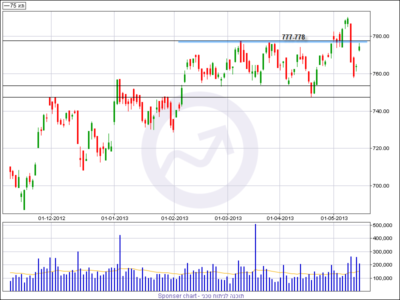 מדד ת"א 75 – תחילת שבוע המסחר הייתה חיובית כשהמדד נסחר מעל רמת ההתנגדות סביב 777/8 נקודות שמתנגדת לא מעט זמן. המדד הגיע בגבוה השבועי לאזור של 790 נקודות אולם ביום המסחר האחרון לשבוע ירד בעוצמה ובחדות. העיבה במיוחד מניית לייבפרסון שהיא לבד לקחה כ 1% בקירוב ורק 4 מניות מהמדד סיימו ללא שינוי או במגמה חיובית. טכנית המדד חזר מתחת לאזור הפריצה ועל פניו נראה שקבלנו באמצע השבוע פריצת שווא. היעד כעת הינו אזור התמיכה בין 747-753.