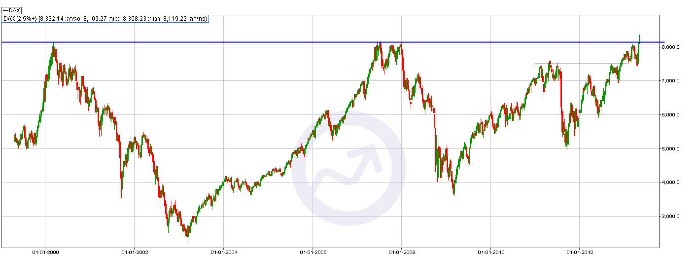 מדד DAX גרמניה - מדד הדקס הגרמני כולל בתוכו את 30 החברות בעלות השווי הגבוה ביותר בגרמניה ביניהם BMW, מרצדס, אדידס, דויטשה בנק חברת התרופות מרק ועוד. הבורסה בפרנקפורט מהווה גורם חשוב ואינדיקטור עיקרי לכל השווקים בעולם במהלך יום המסחר בישראל ובטרם נפתח המסחר בארה”ב. כפי שניתן לראות בגרף השבועי המצורף (משנת 1999) מדד המניות הגרמני פרץ השבוע את שיא כל הזמנים ובכך התקבל איתות קניה ברור וחד משמעי. בכל מקרה רמת 8000 הנקודות מהווה סטופ למהלך העולה וכל עוד המדד נמצא מעל רמה זו איתות הקניה בתוקף.