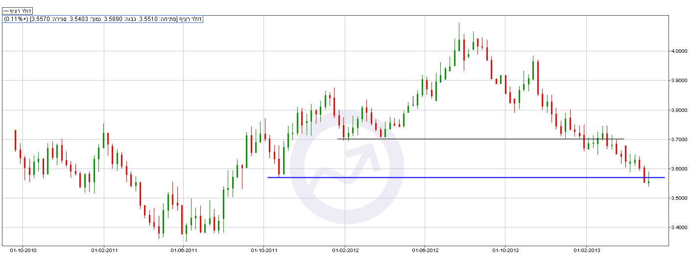 שקל-דולר – המטבע האמריקאי המשיך להחלש מול השקל בשבוע החולף, ונסחר כעת (שישי) סביב רמה של 3.556 ש"ח לדולר. בורסות וול סטריט נסחרו אמש (חמישי) במגמה שלילית מתונה ונרשמו ירידות שערים קלות בכל המדדים לאחר ימים של עליות ושבירת שיאים חיוביים. היום (חמישי) התפרסם נתון תביעות האבטלה השבועיות. לאחר הירידה הדרמטית בנתון בשבוע שעבר לשפל של 5 שנים, השבוע חזו האנליסטים עלייה של 12 אלף תביעות ל- 335 אלף תביעות חדשות. בפועל דווחה הלשכה לסטטיסטיקה בארה"ב על ירידה נוספת של 4,000 תביעות, לרמה של 323 אלף. זוהי הרמה הנמוכה ביותר מאז ינואר 2008. (קרדיט ל iFOREX). מהבחינה הטכנית, הדולר המשיך להפגין חולשה לאחר ששבר את רמת התמיכה של 3.70 ₪ לדולר ולעת עתה הוא קרוב לשבור סופית גם את רמת התמיכה הבאה השוכנת סביב רמה של 3.57 ש"ח לדולר ושבירה סופית שלה תהווה איתות מכירה נוסף עם יעד באזור 3.40 ש"ח לדולר.