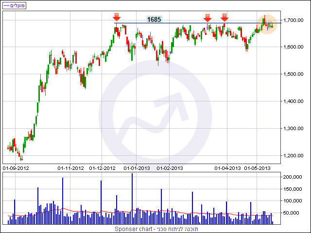 מנתונים יבשים אלו ניתן ללמוד כי מנית פועלים עדיפה על פני שאר מניות הבנקים במונחי תנודתיות/תשואה לתקופה שמתחילת השנה הנוכחית. מהזווית הטכנית המניה רשמה לפני כשבוע+ גבוה תקופתי חדש לאחר שפרצה את רף ההתנגדות האופקי ברמה של 1,685 נקודות, אולם ביום המסחר שלאחריו המניה התהפכה וחזרה להיסחר מתחת לרמת ההתנגדות. בפועל נרשמה פריצת שווא אך יחד עם זאת המניה לא שינתה מגמה ובפועל עברה להיסחר בתנועה צידית מתחת לרף ההתנגדות האופקי