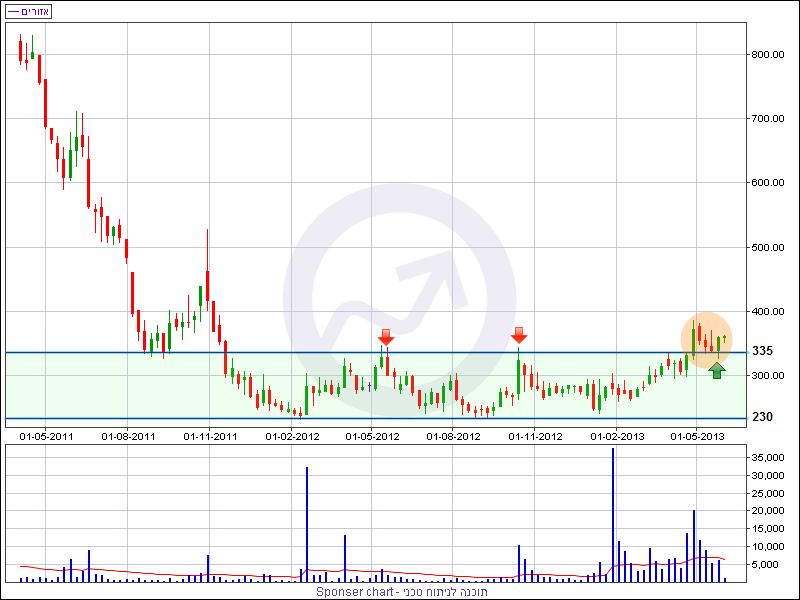 מניית אזורים פרצה לפני כחודש ימים את הרף העליון של טווח הדשדוש הממושך אשר נמתח על פני תקופה של למעלה משנה. בשפל המניה נסחר סביב 233 נקודות בעוד שהרף העליון נע סביב 340 נקודות. הדשדוש הממושך גילם את השינויים שעברו על החברה מתחילת 2011.