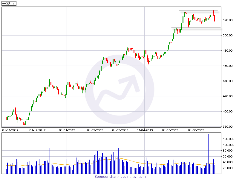 מדד היתר 50 עוד הספיק לעשות גבוה חדש השבוע במסחר התוך יומי אולם נבלם בגבוה הקודם סביב 532 נקודות. טכנית גם כאן המימוש ביום המסחר האחרון היה אגרסיבי ונראה שהמדד החזק בבורסה בחודשים האחרונים בשל גם הוא לתיקון יורד. רמת התמיכה הקרובה נמצאת סביב 509/10 נקודות, שבירה של רמה זו תביא להעמקת הירידות עם יעד לכיוון 490 נקודות.