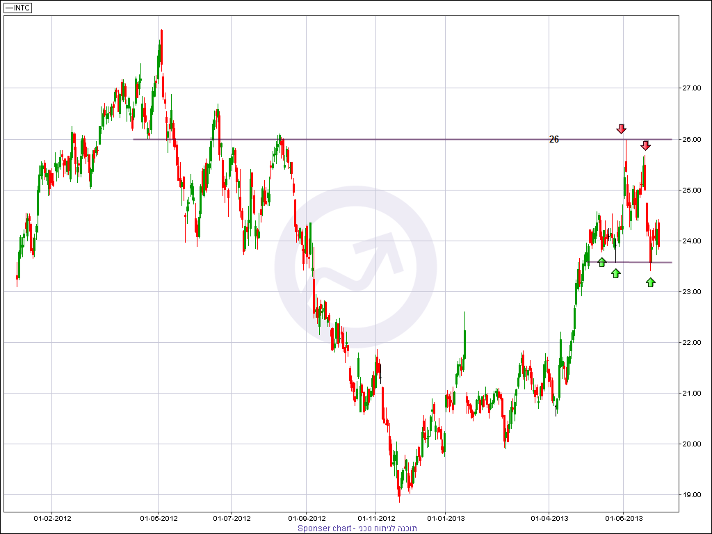 אזור תמיכה חשוב נמצא סביב רמה של 23.5 דולר, נעילה מתחת תאשר המשך תיקון עם יעד יורד לכיוון 21.5-22 דולר בטווח הקצר. עוד אציין שעונת הדוחות בפתח והחברה תפרסם את דוחותיה לרבעון הראשון של השנה בעוד כשבועיים, ב- 17.7.13 לאחר נעילת המסחר. צפי האנליסטים הינו רווח למניה של 0.39 סנט.
