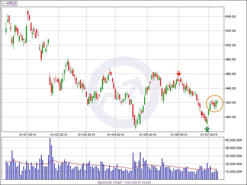 מזווית הטכנית, המניה קטעה את רצף הירידות ביום המסחר הראשון של חודש יולי, אולם הזינוק קטע כבר ביום המסחר השלישי של החודש ומאז המניה מדשדשת בטווח מחירים צר $423-$411. דשדוש המתקבל לאחר גל עולה רציף , גם אם מדובר בשלושה ימי מסחר, מזין לרוב דשדוש קצר שבסופו של דבר מסתיים במהלך עולה המשכי.