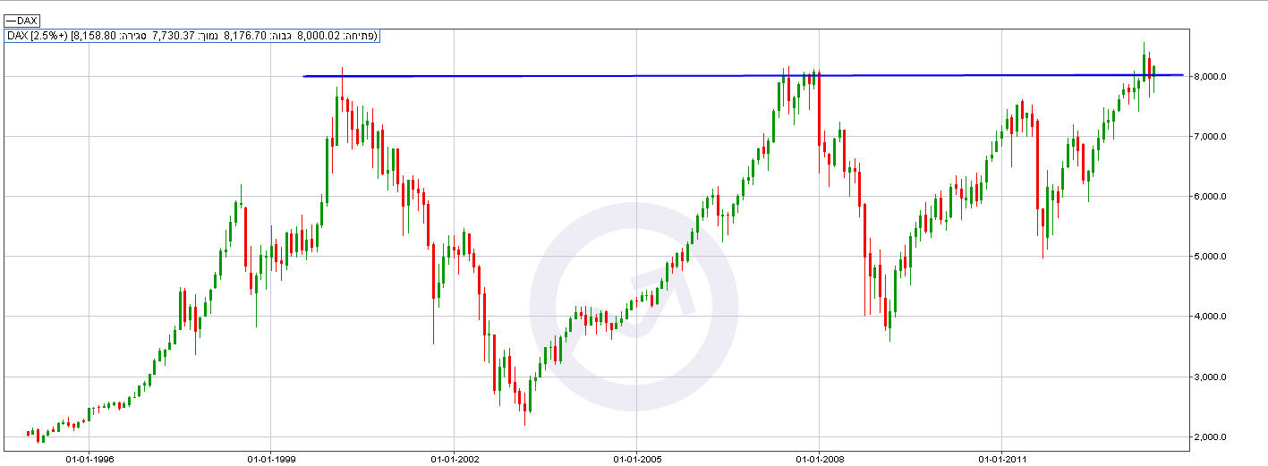 מדד הדקס הגרמני כולל בתוכו את 30 החברות בעלות השווי הגבוה ביותר בגרמניה ביניהם BMW, מרצדס, אדידס, דויטשה בנק חברת התרופות מרק ועוד. הבורסה בפרנקפורט מהווה גורם חשוב ואינדיקטור עיקרי לכל השווקים בעולם במהלך יום המסחר בישראל ובטרם נפתח המסחר בארה”ב. כפי שניתן לראות בגרף החודשי המצורף (משנת 1996) מדד המניות הגרמני נתמך והצליח לעלות חזרה מעל לרמת 8000 הנקודות בעזרת עלייה חדה של כמעט 5% השבוע, ובאזור זה ייבחן בימים הקרובים.