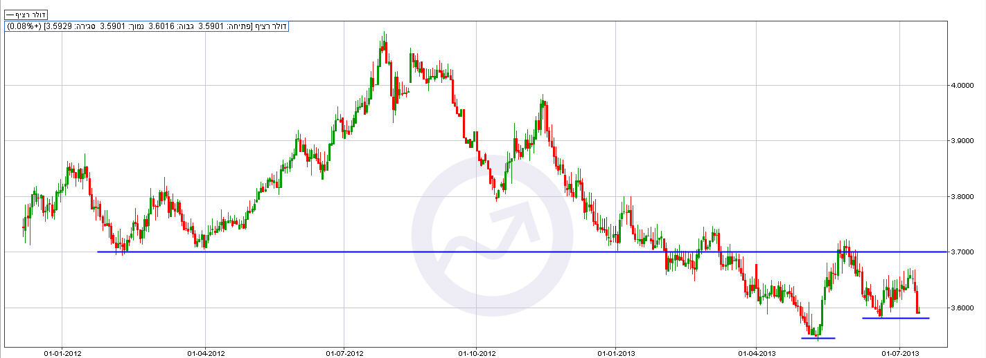 המטבע האמריקאי נחלש מול השקל בשבוע החולף בעיקר לקראת סופו, ונסחר כעת (שישי) סביב רמה של 3.59 ש"ח לדולר. המסחר בוול סטריט (חמישי) נחתם בעליות שערים חדות שהובילו את מדדי ה- S&P 500 והדאו ג’ונס לשיאים חדשים. זאת לאחר שאתמול יו"ר ה’פד’ בן ברננקי הרגיע את השווקים כאשר טען כי המדיניות המרחיבה לא תיפסק בקרוב. ברננקי, חזר והדגיש אתמול את עמדת הבנק המרכזי, כי לא מתוכננת העלאת ריבית בתקופה הקרובה, גם אם יעד האבטלה של 6.5% יושג. הריבית האמריקנית אפסית כיום, כחלק מהמדיניות המוניטרית של ה’פד’. בדבריו הוא ביקש להבהיר ביתר שאת את מדיניות ה’פד’, אשר מזרים לשוק מדי חודש 85 מיליארד דולר ברכישות אג"ח, שאמורות להפסק לחלוטין עם השגת יעד האבטלה. "בהנתן חולשת שוק העבודה והאינפלציה נמוכה, ייתכן ורק הרבה אחרי שנגיע ל-6.5% שיעורי הריבית יגיעו לרמה משמעותית". מהבחינה הטכנית, הדולר מדשדש סביב אזור 3.60 ש"ח לדולר ואם לא תהיה הפתעה חדשה, המטבע האמריקאי צפוי להמשיך ולדשדש ברמות הנוכחיות בשבועות הקרובים.
