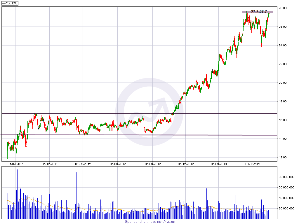 ניתוח טכני – מנית יאהו נסחרת סביב רמות שיא של 5 השנים האחרונות וזאת לאחר מהלך עולה חד מאוד שהחל מפריצת טווח הדשדוש ברבעון האחרון של שנת 2012 שהביא למהלך עולה מכובד של מעל 60% בחודשים האחרונים.