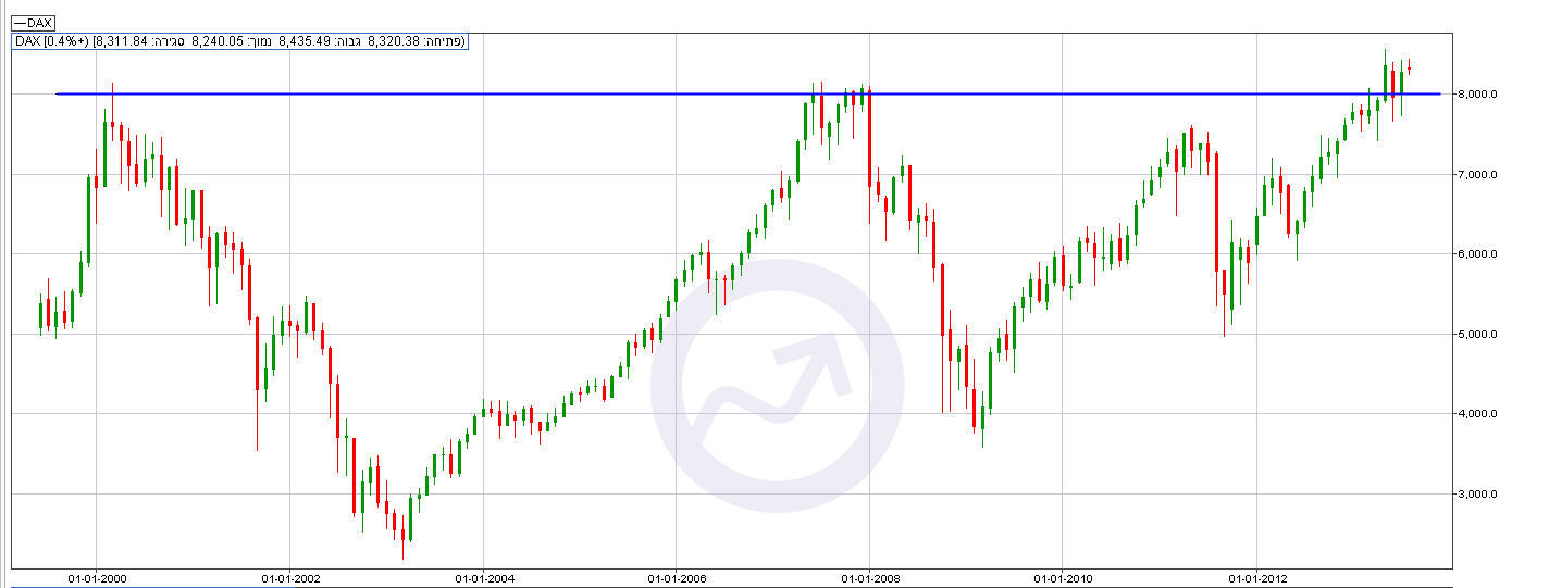 מדד הדקס הגרמני כולל בתוכו את 30 החברות בעלות השווי הגבוה ביותר בגרמניה ביניהם BMW, מרצדס, אדידס, דויטשה בנק חברת התרופות מרק ועוד. הבורסה בפרנקפורט מהווה גורם חשוב ואינדיקטור עיקרי לכל השווקים בעולם במהלך יום המסחר בישראל ובטרם נפתח המסחר בארה”ב. כפי שניתן לראות בגרף החודשי המצורף (משנת 1996) מדד המניות הגרמני נתמך ומתחיל לייצר מהלך עולה משמעותי מעל לרמת 8000 הנקודות וככל הנראה ימשיך צפונה בחודשים הקרובים.