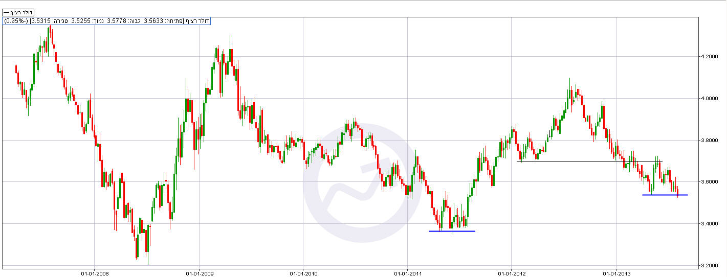 המטבע האמריקאי נחלש מול השקל גם בשבוע החולף, ונסחר כעת (שישי) סביב רמה של 3.53 ש"ח לדולר. המסחר בוול סטריט (חמישי) נחתם בעליות שערים, ובכך קטע רצף ירידות של 3 ימים, וזאת על רקע עליות באירופה ובאסיה בזכות כמה נתוני מאקרו טובים. מהבחינה הטכנית, הדולר על סף שבירת רמת תמיכה טכנית חשובה באזור 3.55 ש"ח לדולר, ואם אכן המטבע ישבור כלפי מטה הוא צפוי להמשיך ולרדת עד לרמה של 3.40 ש"ח לדולר שמהווה התמיכה הבאה.