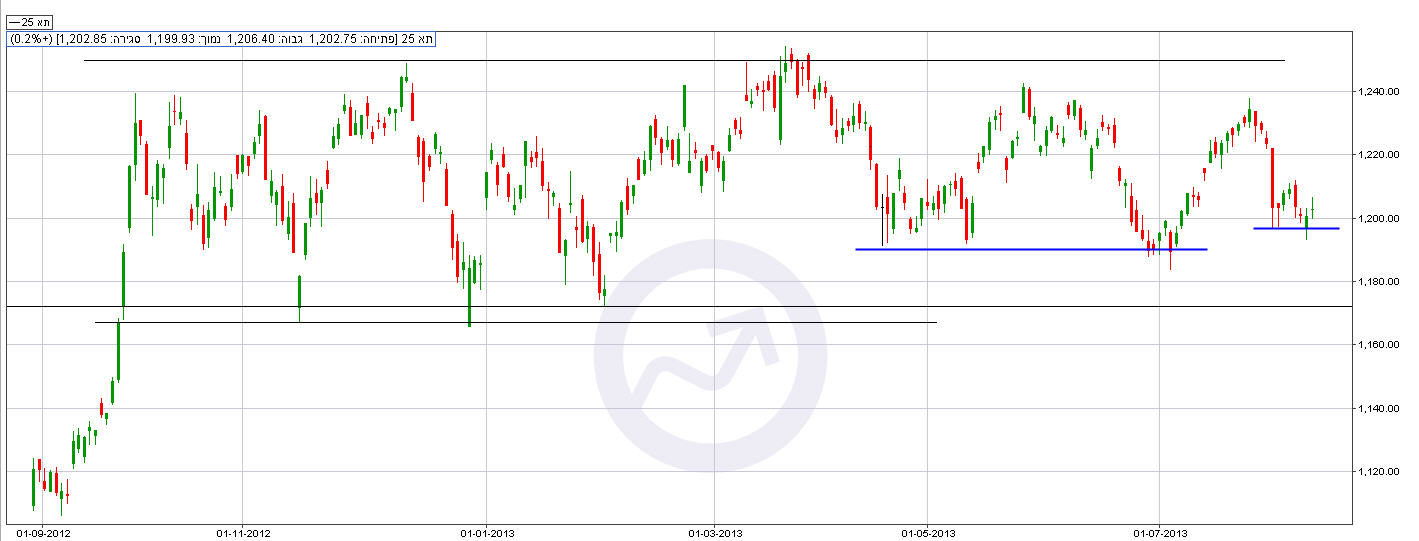 המדד ירד בכ- 0.4% במהלך השבוע החולף, וסיים את המסחר ברמה של 1203 נקודות לאחר שנתמך מעל רמת אזור התמיכה שנמצא סביב רמות של 1190-1195 נקודות. כרגע, רק שבירה של תמיכה זו, תבשר על המשך ירידות שערים לכיוון התמיכה המשמעותית הבאה השוכנת ברמה של 1165 נקודות, אולם כפי שאנחנו כותבים כבר זמן רב, המשך המגמה החיובית בארה"ב לא תשאיר ברירה לשוק המקומי בשלב כלשהוא, אלא לחזור ולעלות לכיוון רמת 1250 הנקודות. רק אם וכאשר תגיע פריצה ברורה לכיוון כלשהוא יתקבל איתות מתאים, ובמקרה כזה הוא יהיה משמעותי מאוד.
