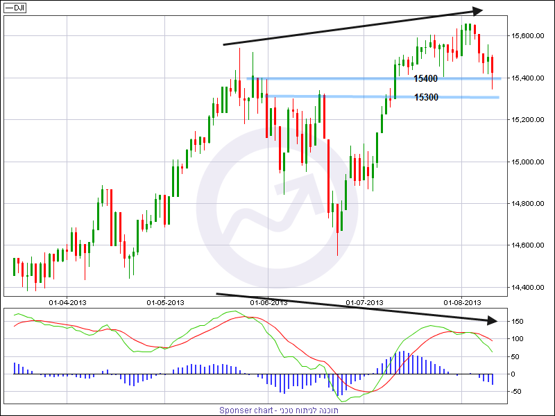 מדד הדאו ג’ונס - לאחר עליות של מעל 17% מתחילת השנה והמצאות בשיאים שטרם נראו במדד מעולם, קיימים בשבועיים האחרונים מספר סימני חולשה מהותיים. הגבוה האחרון שנקבע מעל לשיאים של חודש מאי האחרון לא הצליח להביא להמשך עליה מהותית במדד.