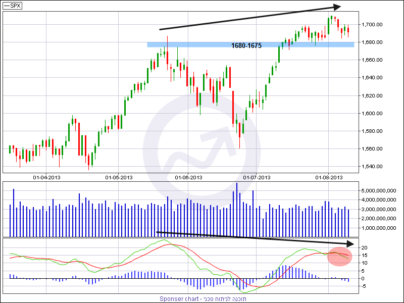 מדד האס אנד פי 500 -בדומה למדד הדאו ג’ונס, מדד האס אנד פי 500 מצייר תמונה טכנית כמעט זהה. המדד אומנם פרץ באמצע יולי את רמות השיא שקבע בחודש מאי האחרון סביב 1680 נקודות אולם גם במקרה הזה לא השכיל לבצע מהלך עליות מהותי ונבלם מעט מעל רמת 1700 נקודות שהיא בעיקר רמת מחיר פסיכולוגית. גם כאן מתנד ה MACD מבצע חיתוך ממוצעים שלילי ובנוסף סטייה דובית בין המתנד לגרף המחירים.