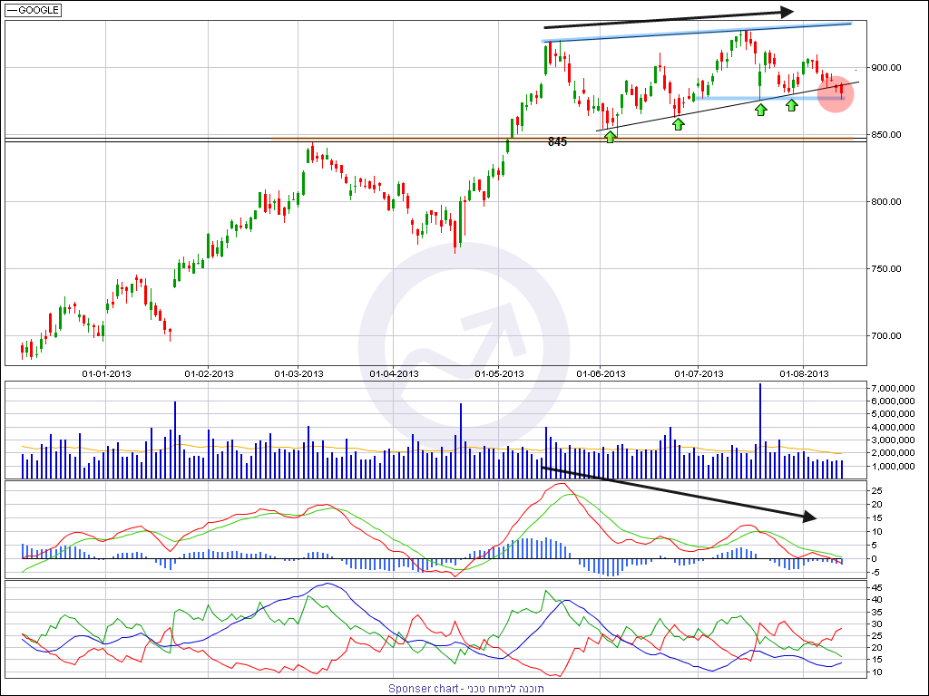 - השבוע שברה המניה קו מגמה עולה מינורי של יתד דובית שהינה תבנית של היפוך מגמה. תמיכה חשובה לטווח הקצר קיימת סביב 875 דולר שהוא הנמוך של חודש יולי האחרון והוא מהווה אישור נוסף ליציאה של התבנית אל הפועל עם יעד יורד לכיוון 815-820 דולר.