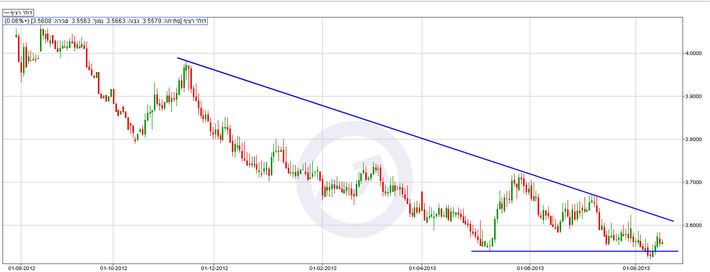 המטבע האמריקאי התחזק מול השקל בשבוע החולף, ונסחר כעת (שישי) סביב רמה של 3.56 ש"ח לדולר. המסחר בוול סטריט (חמישי) נחתם בירידות שערים חדות של כ- 1.5% בממוצע לאחר כמה נתוני מאקרו מרכזיים שהעלו את החשש להפסקת תכנית התמריצים. מהבחינה הטכנית, הדולר הצליח להתמך בקושי מעל רמת התמיכה הטכנית החשובה באזור 3.55 ש"ח לדולר, אולם אם אכן המטבע ישבור כלפי מטה הוא צפוי להמשיך ולרדת עד לרמה של 3.40 ש"ח לדולר שמהווה התמיכה הבאה.