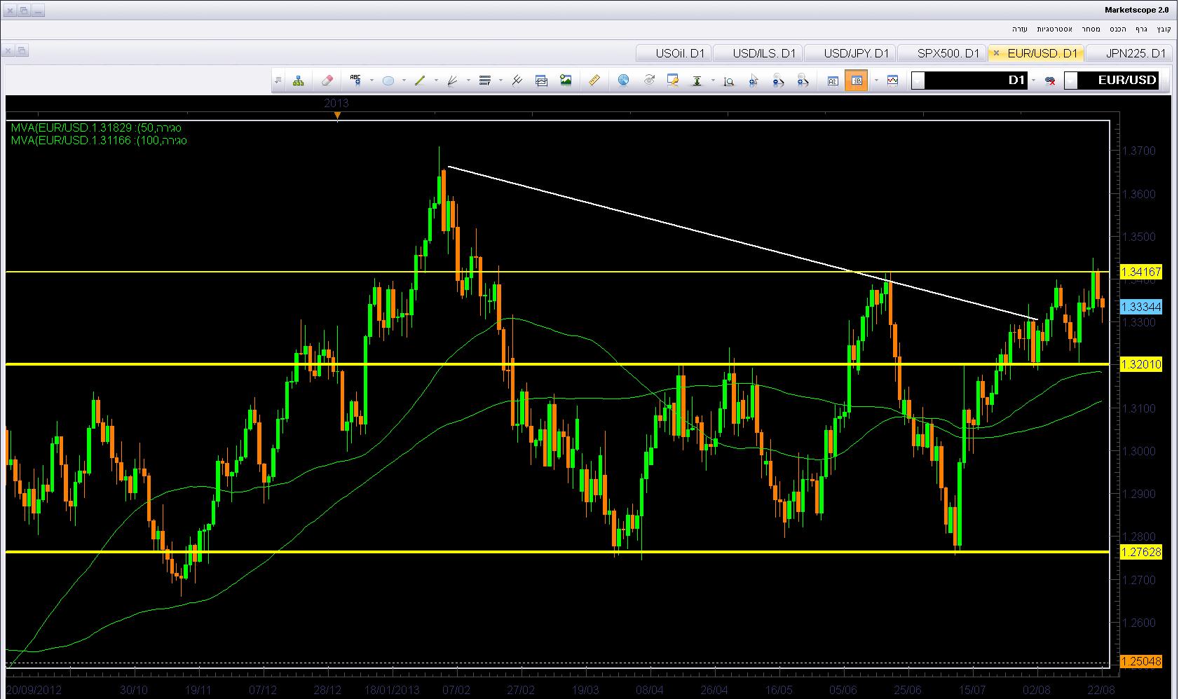 האירו-דולר, הצמד הנזיל בשוק המט"ח העולמי, הצליח השבוע לטפס מעל הפסגה של יוני, לשיא חדש ב-1.345. ואולם, הצמד לא הצליח לנעול יומי מעל 1.34 המומנטום השורי לא האריך ימים והצמד נשבר מטה שוב לאזור 1.33-1.34. אף על פי כן, FXCM רואים מבנה שורי יפה של שיאים ותחתיות עולים, ואין סיבה לשנות את הצפי החיובי כלפי הצמד.