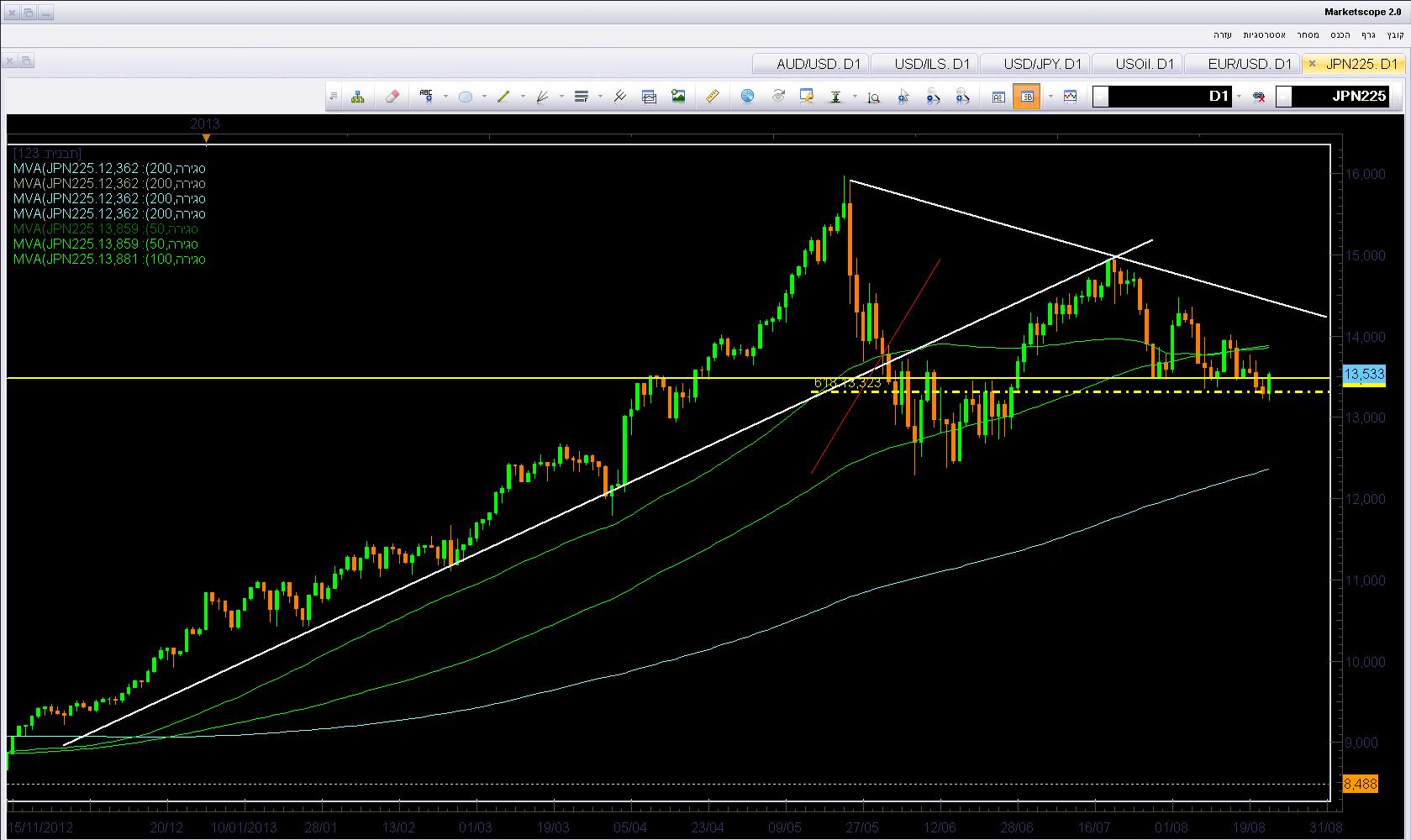 הניקיי נסחר בכבדות השבוע ונראה שהשורים בשוק היפני לא מצליחים להשיג אחיזה. ההתפתחות הטכנית המשמעותית השבוע היתה השבירה מתחת לתחתית הכפולה ב-13,460 וירידה לשפל חדש ב-13,203. ואולם לא ראינו האצה במומנטום השלילי בעקבות השבירה, ואף לפי שעה המדד מצא תמיכה בנסיגת פיבונאצ’י 61.8% של העלייה הקודמת 12,302-14,980. ואולם, המבנה עדיין נראה שתומך בהמשך הירידות וכל עוד המדד מתחת לשילוב של ה-SMA ל-50 ו-100 יום ב-13,780 אין מה להיות אופטימיים.