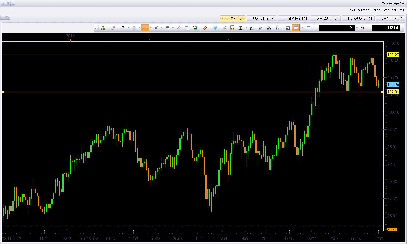 שבוע קשה עבר גם על הנפט, כאשר ניסיון נוסף לפרוץ לשיא חדש נגמר במפח נפש. הסחורה עלתה במומנטום חזק עד 108.13, פיפסים ספורים משני השיאים הקודמים, ואז, על רקע ההרעה בסנטימנט העולמי, נשברה מטה בחוזקה והיא שוב בתחתית הטווח. כעת שוב גוברת הסבירות לשבירה מתחת ל-103 ולמפנה במומנטום בטווח הקרוב, כלפי מטה. לסיכום, 103 ו-109 הם גבולות הגזרה, ומי שיצליח לפרוץ אותם ינצח בקרב הורדת הידיים העיקשת הזו בין השורים לדובים.