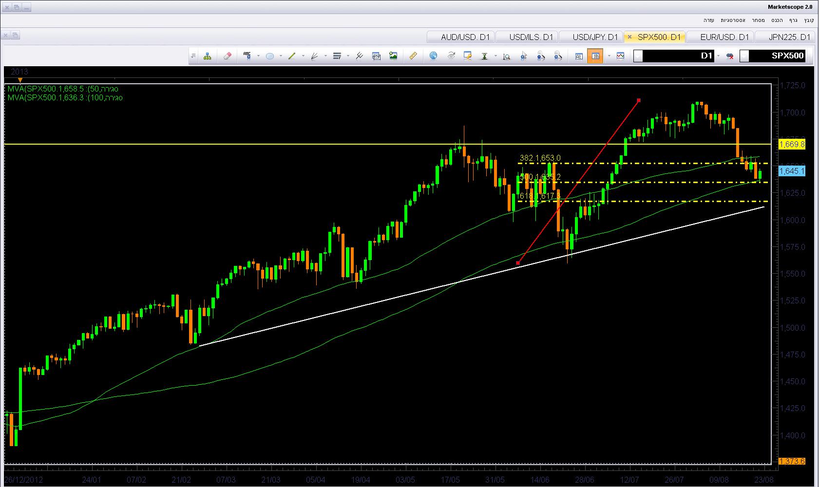 מדד ה-S&P500 ממשיך להתגלגל מטה. לאחר שנשבר מתחת לשיא של ה-20/5 ב-1,670 ראינו האצה מטה אל תוך תחומי פיבונאצ’י (הקווים המקווקווים), המסמנות גבולות של תיקון. המדד צנח גם מתחת לרמת ה-SMA ל-50 יום (הקו המפותל העליון), אבל מצא לעת עתה תמיכה בשילוב החזק של רמת פיבונאצ’י 50% וה-SMA ל-100 יום (הקו המפותל התחתון) ב-1,634. ירידה מתחת רמה זו תחשוף את 1,617 – רמת פיבונאצ’י 61.8% וקו מגמה המחבר שתי תחתיות משמעותיות מאז פברואר. עלייה חזרה מעל ה-SMA ל-50 יום עשויה להטות שוב את הכף לטובת השורים.