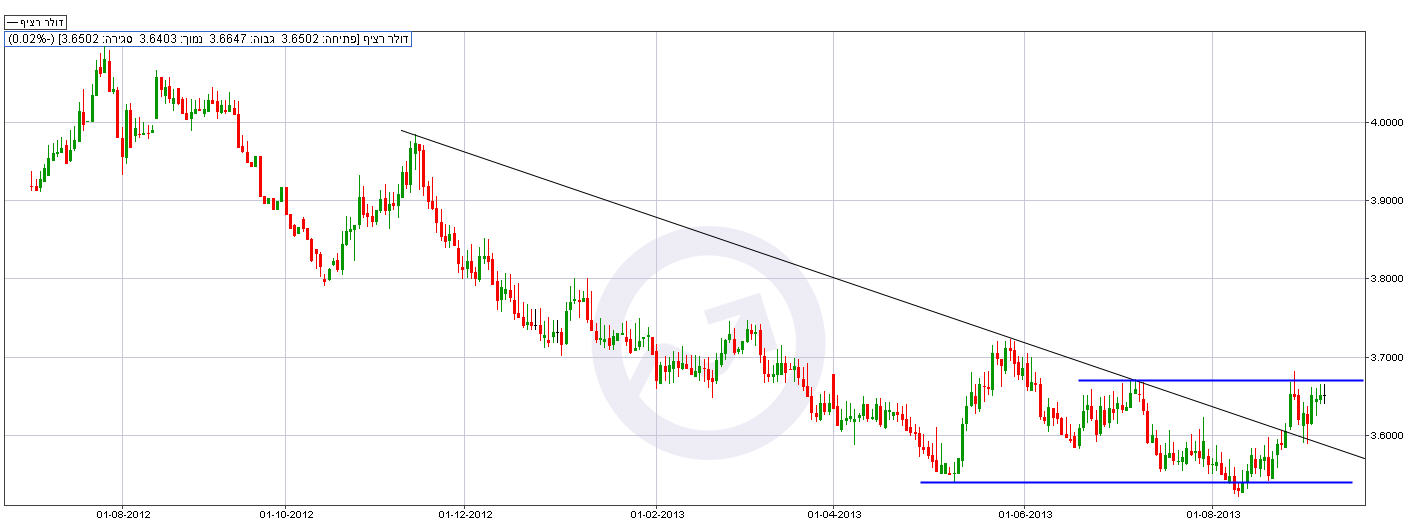 המטבע האמריקאי התחזק מעט מול השקל בשבוע החולף, ונסחר כעת (שישי) סביב רמה של 3.64 ש"ח לדולר. המסחר בוול סטריט (חמישי) נחתם בעליות שערים קלות על רקע כמה נתוני מאקרו חיוביים שפורסמו לפני ובמהלך המסחר, גם בורסות באירופה ננעלו אמש (חמישי) בעליות לאחר הודעת הריבית של הבנק המרכזי האירופי ועל רקע תחזית הפדרל ריזרב בארה"ב לצמיחה איטית בכלכלה הגדולה בעולם. הבנק המרכזי של אירופה והבנק של אנגליה הודיעו כי הם מותירים את הריבית על שפל של 0.5%, וזאת בהתאם לציפיות האנליסטים. בדברים שנשא לאחר פרסום החלטת הריבית, אמר דרגי כי הבנק מתכוון להותיר את הריבית נמוכה לפרק זמן ארוך. מהבחינה הטכנית, לאחר שהדולר הצליח להיתמך שוב מעל רמת התמיכה הטכנית החשובה באזור 3.55 ש"ח לדולר, הוא זינק כמעט עד ההתנגדות סביב 3.67 ש"ח לדולר, אולם חזר לדשדש בטווח הנ"ל, רק פריצה של אזור הדשדוש תהווה איתות לאותו כיוון.