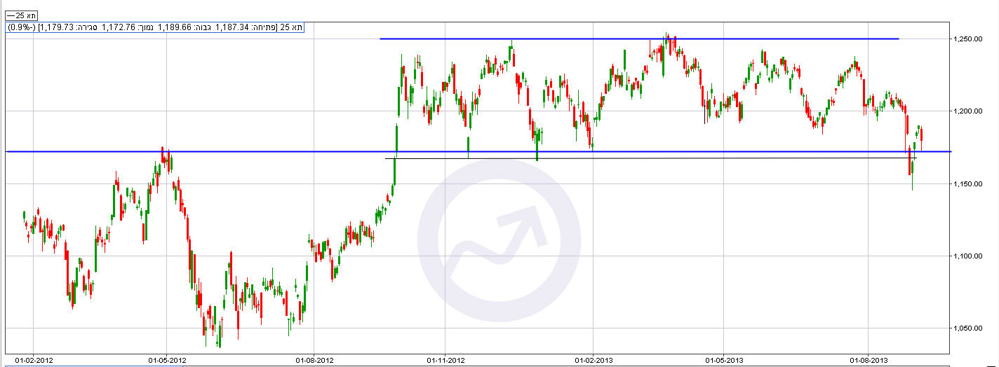 המדד נותר כמעט ללא שינוי במהלך השבוע החולף, וסיים את המסחר ברמה של 1180 נקודות. לאור החששות מתקיפה בסוריה ותגובות אפשריות כלפי ישראל, המדד ירד בשבוע שעבר נקודתית מתחת לרמת התמיכה השוכנת סביב אזור 1165 נקודות, אולם הצליח לחזור ולהסחר מעליה. רק שבירה ברורה של תמיכה זו, תבשר על המשך ירידות שערים משמעותיות לכיוון התמיכה הבאה השוכנת ברמה של 1100 נקודות. מנגד, חזרה למסלול חיובי בארה"ב צפויה למשוך את מדדי המניות המקומיים כלפי מעלה.