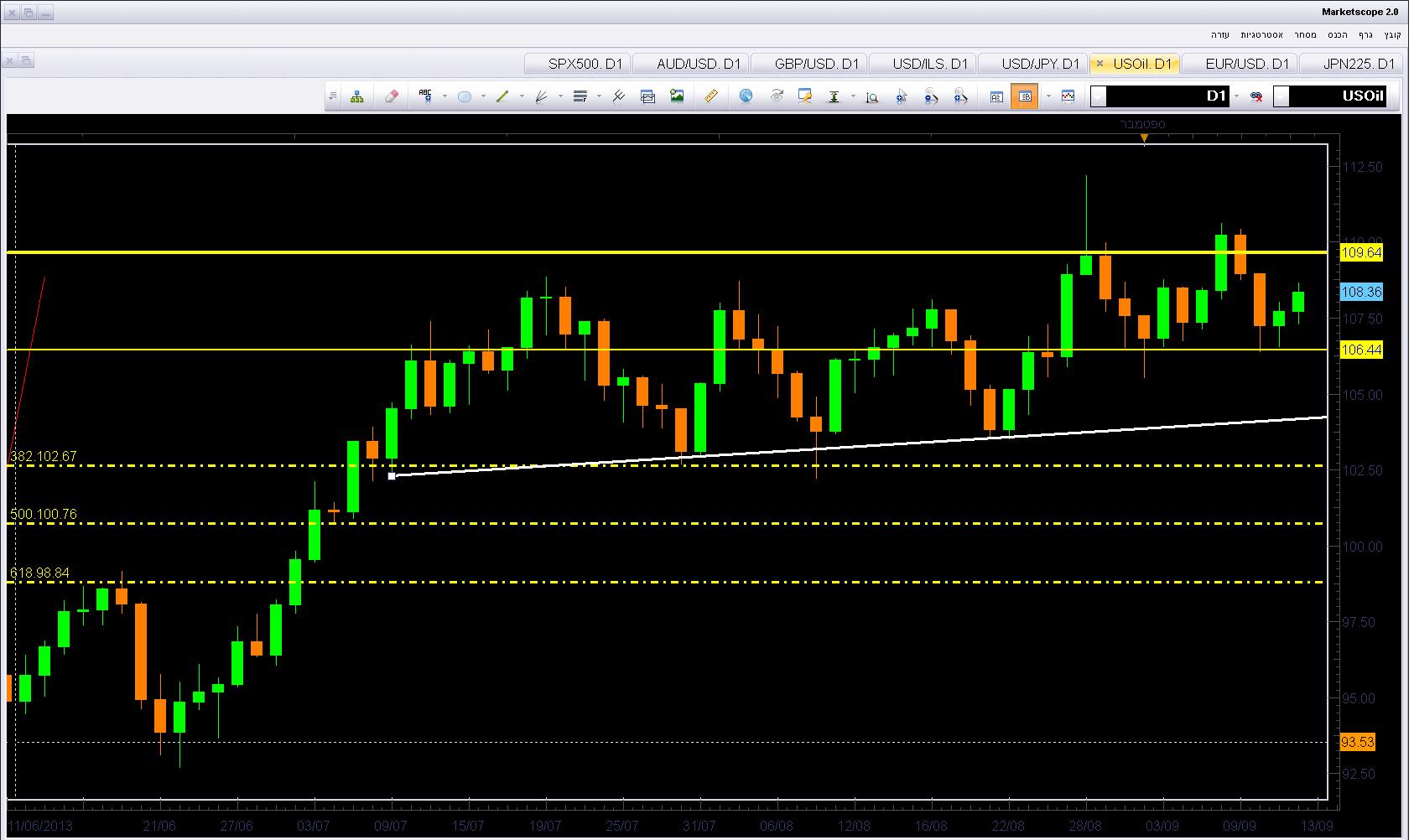 הנפט נסחר בשבועות האחרונים בעיקר על פי ההתפתחויות בגזרה הסורית. בתחילה, האיום המוחשי במתקפה, הזניק את הנפט לשיא של שנתיים ב-112 דולר לחבית, ואולם השבוע, על רקע ההשהיה של המתקפה והמגעים הדיפלומטיים הנפט שוב נסוג לאחור. בסך הכול המגמה של הנפט היא עולה ללא קשר לעניין הסורי, וכעת יש לראות האם הנפט יצליח להמשיך במסע הטיפוס מעלה או שנראה תיקון מטה לאחר כמעט חצי שנה של עלייה. עלייה מעל 110 שוב תאותת על רצון של השוק להעפיל לשיא חדש מעל 112. מנגד, ירידה מתחת לגבול ב-106.5 עשויה ליצור סחף שלילי ולהצניח את הנפט לעבר התמיכה הראשונית בקו העולה ב-104.3.