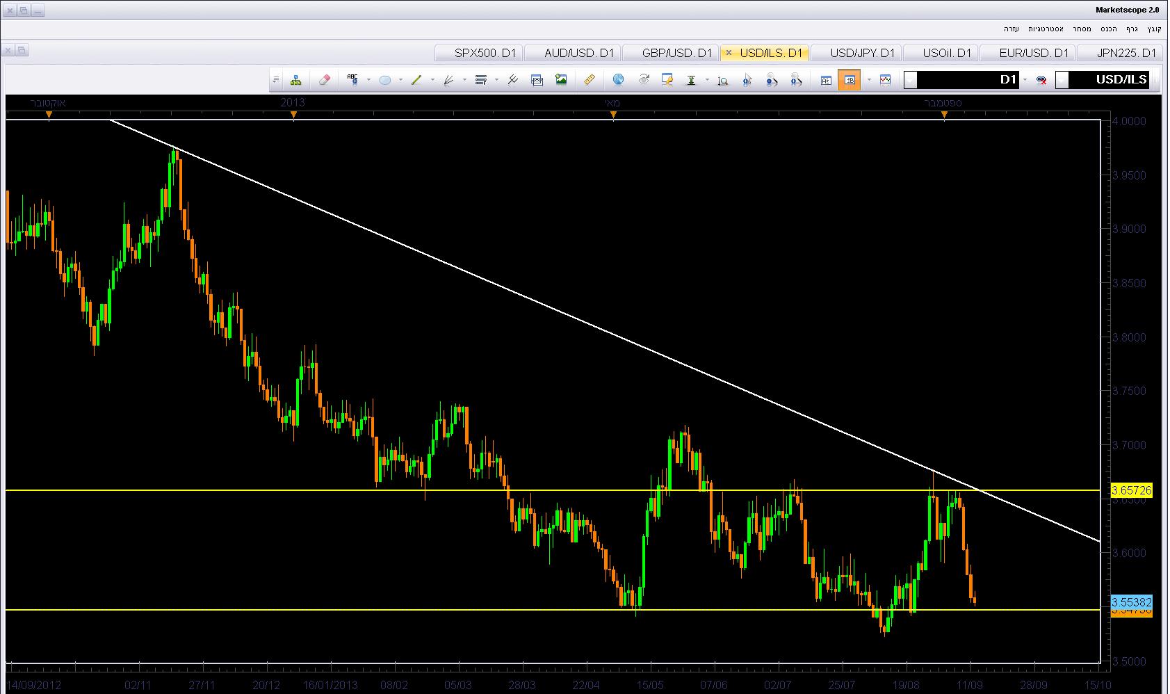 גם הדולר-שקל מאוד הושפע מההתחממות הגיאו-פוליטית. כאשר המתקפה עמדה על הפרק, השקל ניזוק קשות בעקבות בריחת המשקיעים מהמטבע הישראלי, בשל הסיכון הגיאו-פוליטי. בעקבות כך, הדולר-שקל זינק עד אזור המפתח ב-3.66, שם הצטלב קו המגמה היורד שמחבר את השיאים היורדים מהפסגה של 2012 ב-4.09, עם קו ציר אופקי שהיווה תמיכה והתנגדות לסירוגין. הבלימה בהתנגדות הזו היתה עזה והדולר-שקל מיד שב לנוע מטה על פי המגמה היורדת בטווח הארוך יותר. כעת הצמד בוחן תמיכה קריטית ב-3.54, כאשר שבירה מתחתיה תסלול את הדרך לשפל חדש, מתחת ל-3.525.