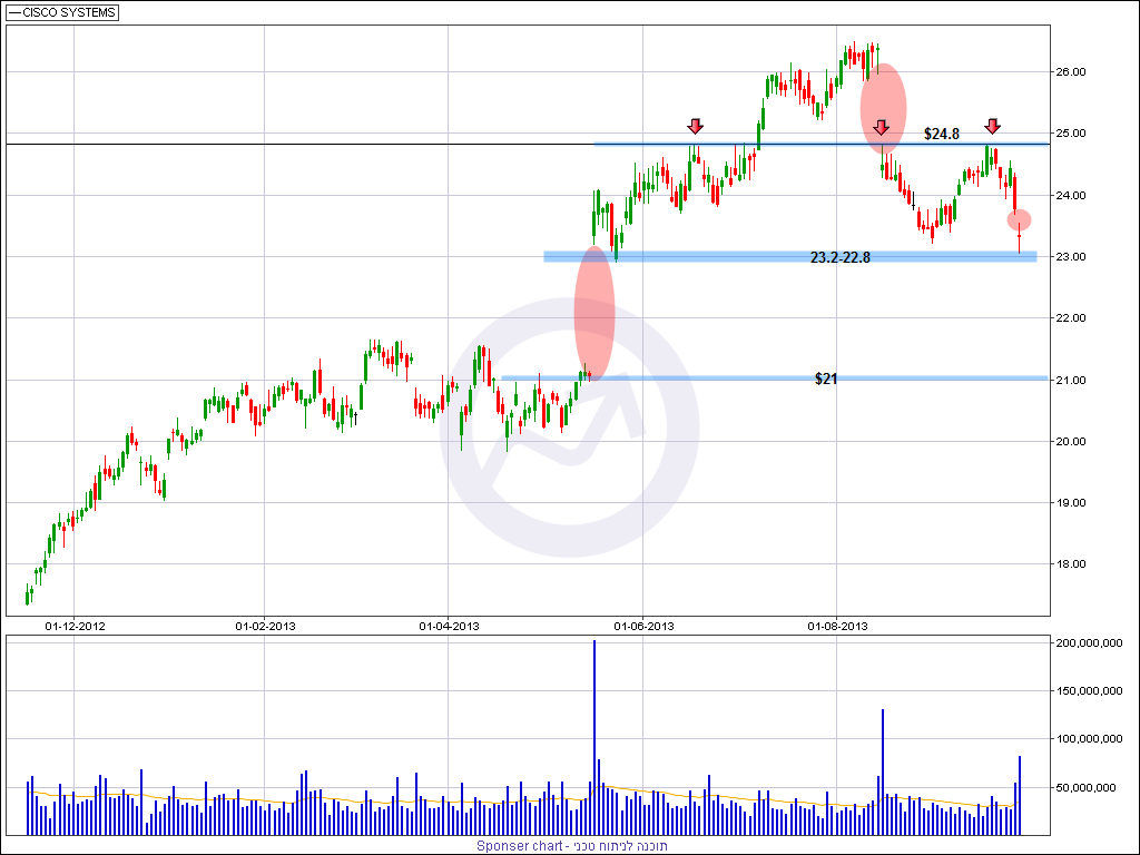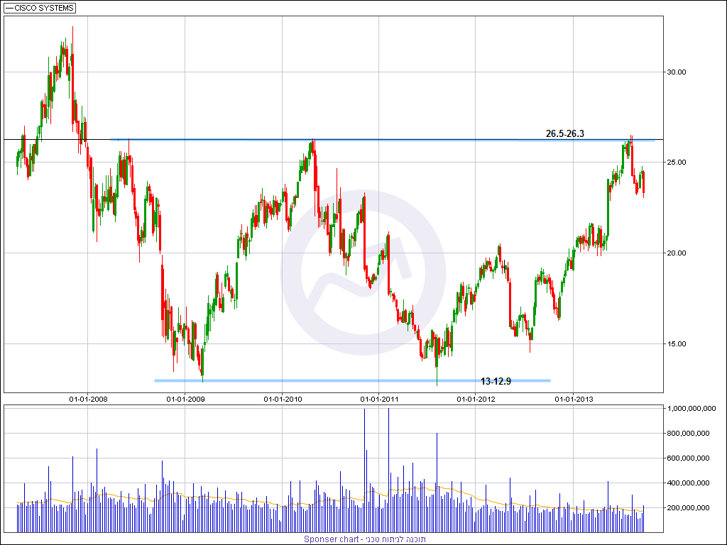 מהזווית הטכנית, מניית סיסקו התממשה לאחרונה מרמות שיא של 5 שנים והתנגדות אופקית חזקה ומהותית מאוד סביב רמה של 26.3-26.5 דולר למניה, כל זאת בזמן שהמדדים המובילים קובעים רמות שיא חדשות, דבר שמראה על החולשה היחסית של המניה ביחס למדדים בהם היא נסחרת ופורטו לעיל.